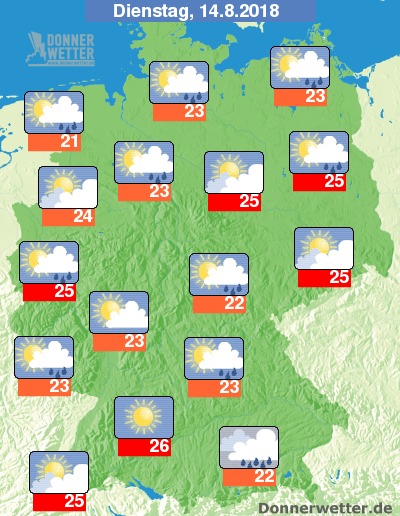 Am Dienstag zeigen sich teils heitere Abschnitte, teils ziehen jedoch dichte Wolken durch, dabei bilden sich gebietsweise Schauer und vereinzelt auch Gewitter. Im Südwesten bleibt es bei weitgehend heiterem Wetter trocken. Die Temperatur steigt auf 21 Grad in Wilhelmshaven und bis 26 Grad in Karlsruhe.