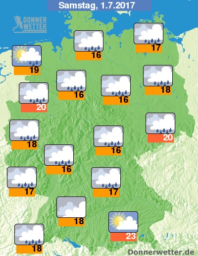 Am Samstag präsentieren sich der Westen und der Norden den Tag über meist verregnet, über der Südosthälfte des Landes bleibt die Wolkendecke ebenfalls größtenteils verschlossen, hier bilden sich wiederholt Schauer. Oft freundlich bei nur seltenen Schauern oder Gewittern ist es im Alpenvorland, hier zeigt sich die Sonne immer wieder. Die Temperatur erreicht Werte zwischen 16 Grad in der Norddeutschen Ebene und bis 23 Grad in München.