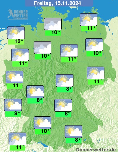 Am Freitag zeigt sich der Himmel zunächst noch verbreitet hochnebelartig bewölkt, in der Nordhälfte kann auch etwas Sprühregen fallen. Im Tagesverlauf sind dann vor allem im Süden und Südwesten auch größere Auflockerungen möglich.