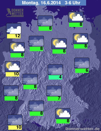 In der Nacht ist es meist aufgelockert bewölkt oder klar, an der Nordsee ziehen auch dichte Wolken durch, die aber kaum Regen bringen, sonst ist es trocken. Die Temperatur geht auf erfrischende Werte zwischen 12 Grad an der Nordseeküste und 4 Grad in einigen Tälern des Harzes zurück.