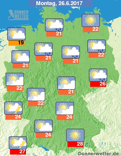 Zunächst halten sich in der Nordhälfte dichtere Wolken, aus denen örtlich noch etwas Regen, oder einzelne Schauer fallen können. Im Tagesverlauf nehmen auch hier wie bereits schon in den anderen Teilen unseres Landes die sonnigen Abschnitte zu. Mit 20 bis 28 Grad bewegen sich die Temperaturen meist in einem angenehmen Sommerbereich. Am Oberrhein, am Bodensee und im Raum Regensburg können wieder schwül-heiße 30 bis 32 Grad angestrebt werden. An den Küsten und auf den Bergen werden dagegen kaum 20 Grad erreicht. Der Wind ist meist nur noch schwach bis mäßig. Am Abend können über dem Schwarzwald erste Wärmegewitter entstehen.