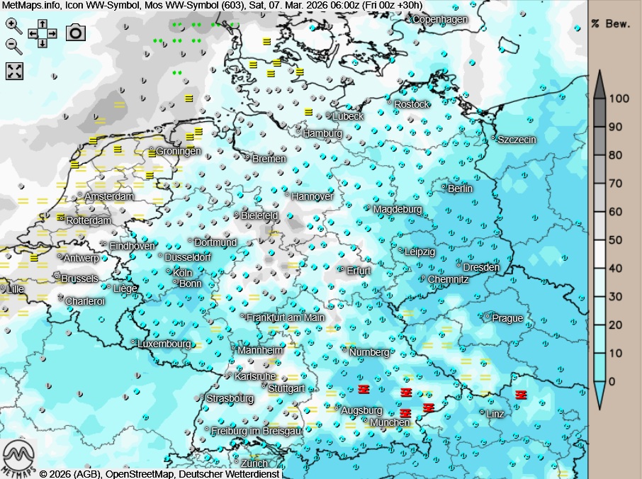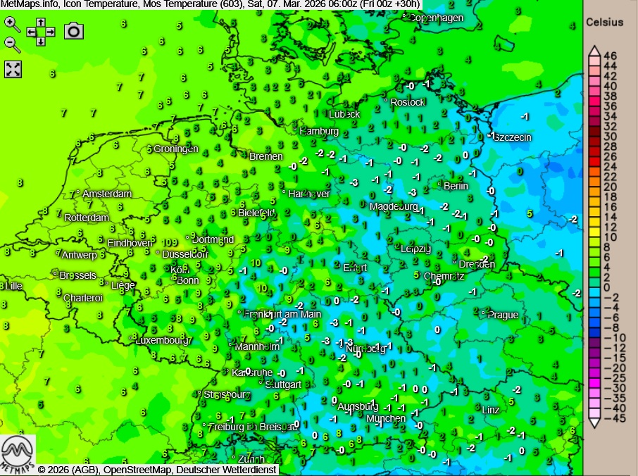 Die Wetter- und Temperaturkarte sowie die 850-hPa-Temperaturanomalie (06:00 Uhr) nach ICON: