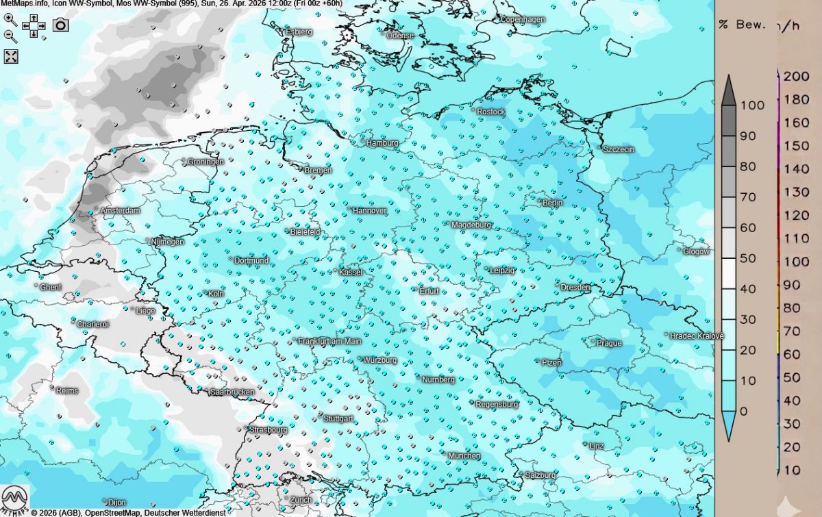 In der Nacht zum Montag klart es auf, was die Temperaturen auf +5 bis -2 Grad sinken lässt – im Nordosten muss man sich lokal sogar auf mäßigen Bodenfrost einstellen.