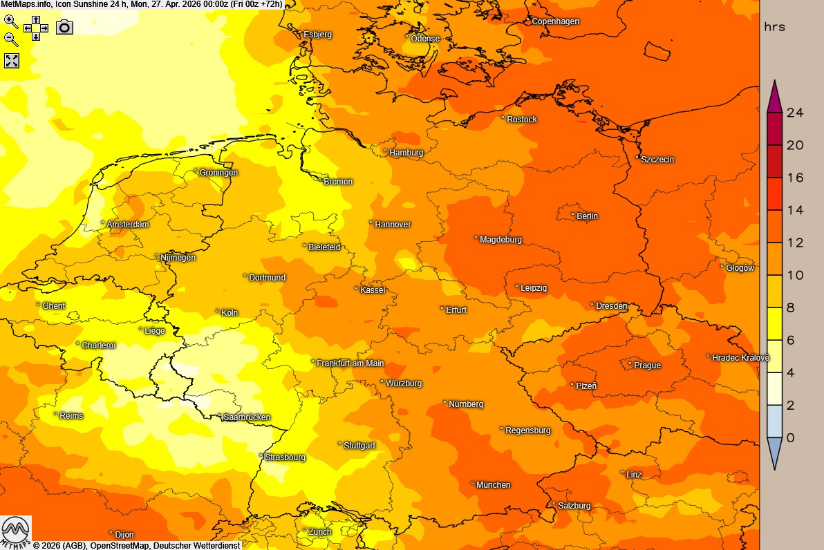 Die Wetterkarte für Sonntag 12:00 Uhr, die Lufttemperaturen um 15:00 Uhr sowie die 24-Stunden-Sonnenscheindauer für Sonntag nach ICON: