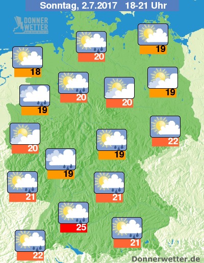 Heute Abend ist es häufig wechselnd bis aufgelockert, oft jedoch auch stark bewölkt, dabei bilden sich gebietsweise Schauer. Die Temperaturen bewegen sich zwischen 18 Grad in Emden und bis 25 Grad in Stuttgart.