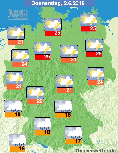 Heute ist es im Süden verbreitet dicht bewölkt und dazu oft regnerisch. Weiter nach Norden hin wechseln sich Sonne und teils dichte Wolken einander ab und besonders in den Nachmittagsstunden bilden sich gebietsweise Schauer und teils kräftige Gewitter. Die Temperatur steigt auf 16 Grad in Unterfranken und bis 26 Grad in Berlin.
