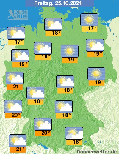 Am Freitag hält sich anfangs noch stellenweise Nebel oder Hochnebel. Im übrigen Land strahlt jedoch verbreitet die Sonne und es ziehen überwiegend nur lockere Wolkenfelder durch, dabei bleibt es trocken. Die Temperatur erreicht Werte von 17 Grad an der Müritz und bis 21 Grad entlang des Rheins.