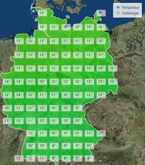 Die Tiefsttemperaturen liegen dabei in der Regel zwischen 10 und 15 Grad, etwas kühler bleibt es nur am Alpenrand und an der Ostsee.