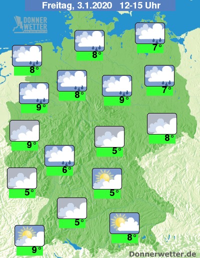 Bis zum frühen Abend ändert sich an den Wetter- und Temperaturverhältnissen recht wenig. Trocken bleibt es zunächst noch im Osten und Süden, nass im Westen und Norden.