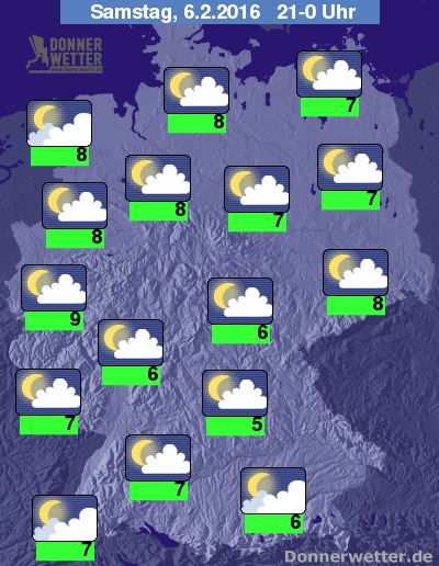 Heute Abend ist es an der Nordsee stark bewölkt, sonst zeigt sich der Himmel hingegen verbreitet locker bis aufgelockert bewölkt, dabei bleibt es landesweit trocken. Die Abendtemperatur liegt bei 9 Grad in Köln und etwa 5 Grad in Unterfranken. Im Westen und Nordwesten weht ein teils starker Wind. Einzelne Sturmböen sind möglich.
