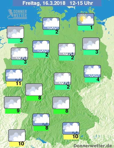 Im Norden hat der kalte Nordostwind bereits für eine deutliche Abkühlung gesorgt. Das Thermometer steigt hier nur knapp über den Gefrierpunkt. An Rhein und Donau werden hingegen nach wie vor Höchstwerte knapp über der 10 Grad Marke gemessen.