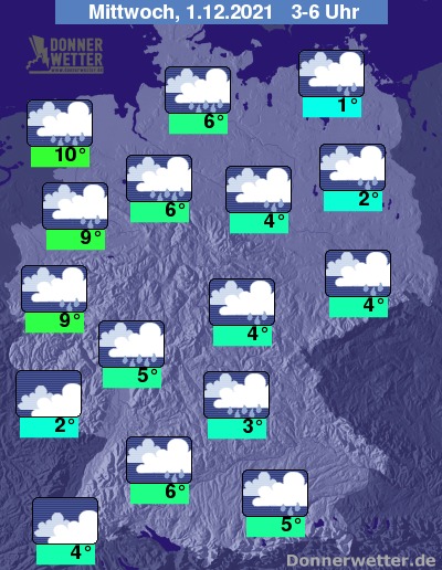 In der Nacht zum Mittwoch ziehen weiterhin dichte Wolken durch und es fällt zeitweise, teils kräftiger Regen, im Süden anfangs noch teils Schnee oder Schneeregen. Die Temperaturen bleiben nahezu konstant oder steigen sogar leicht an und liegen bei 10 Grad an der Nordsee und um 1 Grad an der Müritz. Es weht ein meist starker, teils auch stürmischer Wind. An der Nordsee herrscht weiterhin Sturm.