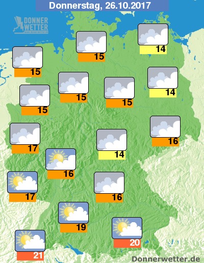 Im Norden und in der Mitte hält sich meist eine zähe Wolkendecke mit nur wenigen Lücken. Stellenweise kann es daraus etwas regnen oder nieseln. Teilweise ist es auch dunstige oder nebelig-trübe. Nach Süden und Südwesten gibt es größere Aufheiterungsabschnitte. Die Höchsttemperaturen liegen meist zwischen 13 und 17 Grad, in denen Gebieten wo sich die Bewölkung den ganzen Tag hält und zwischen 17 und 21 Grad bei längeren Sonnenschein im Süden und Südwesten. Der Wind weht meistens nur schwach bis mäßig, kann aber an den Küsten von Nord- und Ostsee auch zeitweise auffrischen. In der Nacht auf Freitag regnet es im Norden und über den Mittelgebirgen schon häufiger.