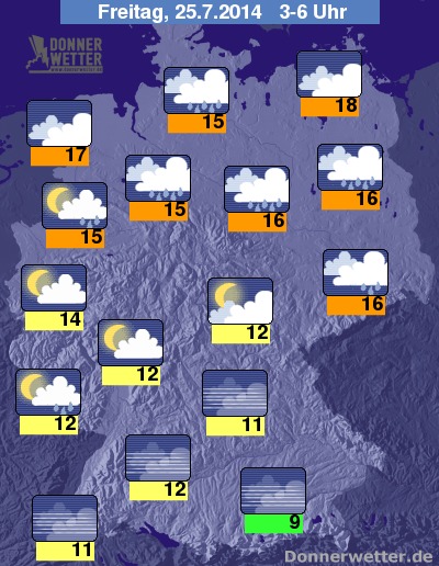 In der kommenden Nacht breiten sich die dichten Wolken mit teils kräftigem und ergiebigem Regen weiter nach Norddeutschland hin aus, sonst ist es dagegen meist locker oder aufgelockert bewölkt, vom Saarland bis nach Rheinland-Pfalz bilden sich gebietsweise Schauer und Gewitter, sonst bleibt es weitgehend trocken. Die Temperatur sinkt auf 18 Grad auf Rügen und etwa 9 Grad im Allgäu.