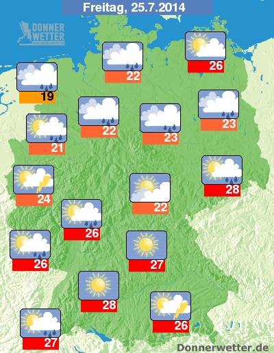 Am morgigen Freitag fällt im Norden und Osten unter vielfach dichten Wolken zeitweise Regen, sonst ist es dagegen meist nur locker oder aufgelockert bewölkt und überwiegend trocken, gebietsweise bilden sich aber vor allem im Westen, aber auch im übrigen Land örtliche Schauer und Gewitter. Die Temperatur liegt bei sommerlich und vielfach schwülen Werten zwischen 19 Grad in Emden und rund 28 Grad in Karlsruhe.