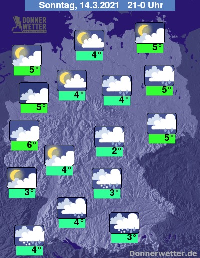 Die Temperaturen sinken bis Mitternacht auf Werte um 6 Grad in der Kölner Bucht um 2 Grad im Thüringer Becken.