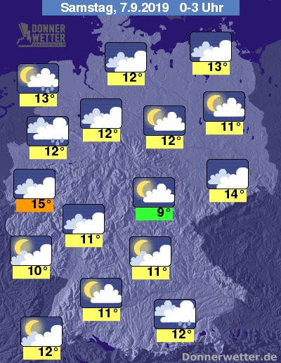 In der Nacht auf Samstag nimmt die Bewölkung über weiten Teilen des Landes zu, der Himmel zeigt sich bis zum frühen Samstagmorgen dann meist bedeckt; einzelne Wolkenlücken kann es an der Spree geben, an der Nordseeküste ist es zeitweise auch sternenklar. Mit regionalen Schauern muss in der Nacht im äußersten Nordosten, in der Lausitz sowie am Alpenrand gerechnet werden, sonst bleibt es meist trocken.
