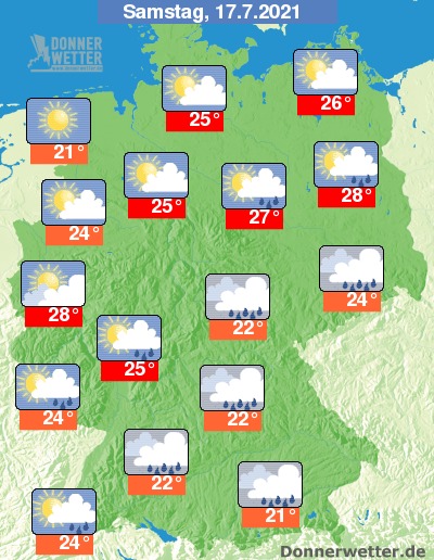 Heute scheint im Norden und Westen Deutschlands verbreitet die Sonne und es ziehen hier höchstens lockere Wolken durch, dabei bleibt es trocken. Im übrigen Bundesgebiet ist es dagegen überwiegend dicht, hier und da auch aufgelockert bewölkt, dazu können sich zum Teil kräftige Schauer und Gewitter bilden. Die Temperatur steigt auf 21 Grad im nördlichen Emsland und bis 28 Grad im Rheinland.