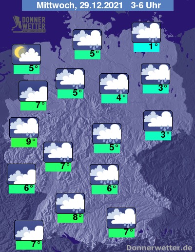 In der folgenden Nacht bleibt es weiterhin bedeckt und es fällt zeitweise Regen. Vor allem über der Nordhälfte ist es auch oft neblig-trüb. Die Temperatur sinkt auf 9 Grad in Bonn und etwa 1 Grad in Stralsund.