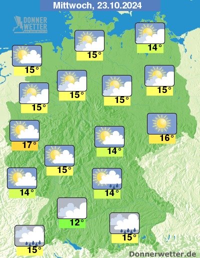 Am Mittwoch bleibt es im Süden überwiegend trüb oder dicht bewölkt, dabei fällt gebietsweise auch Regen. Im übrigen Bundesgebiet ist es verbreitet heiter oder sonnig, teilweise ziehen auch mal mehr Wolken durch, jedoch bleibt es trocken. Die Temperatur steigt auf 12 Grad am Odenwald und bis 17 Grad im Rheinland.