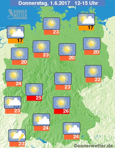 Über Mittag lacht die Sonne fast im ganzen Land von einem strahlend blauen Himmel. Lediglich an den Küsten und in den Mittelgebirgen verdecken zeitweise einzelne Wolken die Sonne. Im Südwesten bilden sich bereits dann erste Quellwolken und das Gewitterrisiko steigt langsam an.