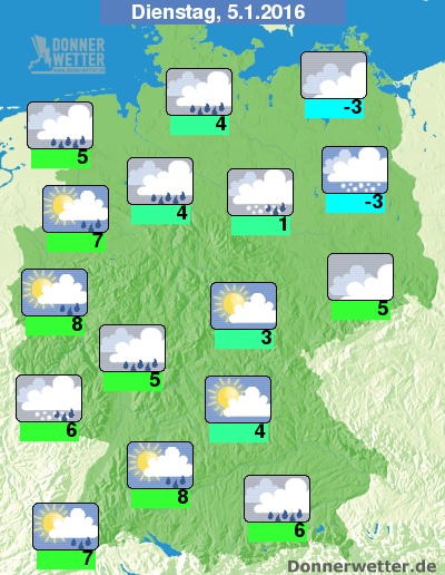 Am Dienstag bleibt es im Norden stark bewölkt und es fällt immer wieder Regen, Schneeregen, Schnee oder auch gefrierender Regen, dabei ist es zum Teil sehr glatt! Im übrigen Land ist es auch meist stark, gebietsweise aber auch aufgelockert bewölkt, es fällt zeitweise Regen, seltender auch Schneeregen. Die Temperatur steigt auf -3 Grad in Berlin und bis 8 Grad in der Kölner Bucht. An den Küsten weht teils starker Wind.