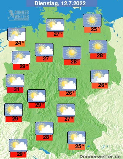 Am Dienstag ist es überwiegend heiter bis sonnig, hier und da, vor allem im Westen und Nordwesten halten sich auch einige Wolken, dabei bleibt es trocken. Die Temperatur steigt auf 24 Grad in Cuxhaven und bis 31 Grad in Köln.