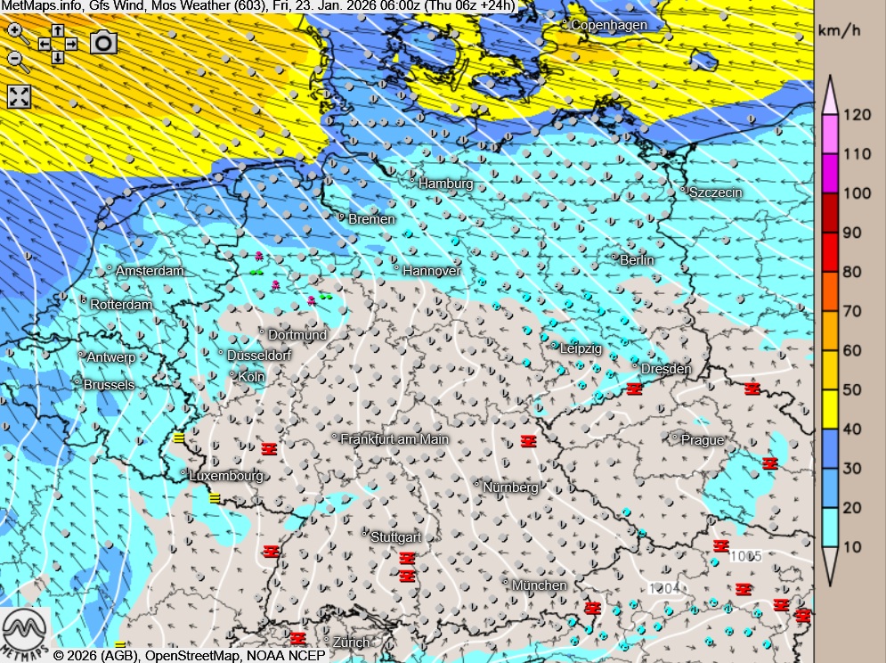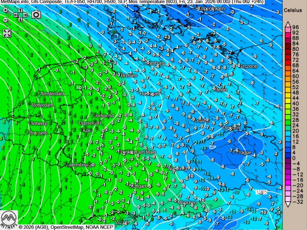 Die Temperatur- / Strömungskarte sowie die Wetter- / Windkarte für Freitagmorgen nach GFS: