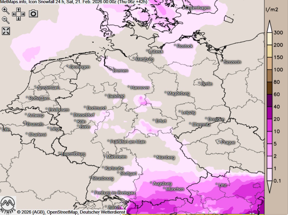 Die Wetter- und Temperaturkarte für Freitagfrüh (06:00 Uhr) sowie die 24-Stunden-Schneemengen am Freitag nach ICON: