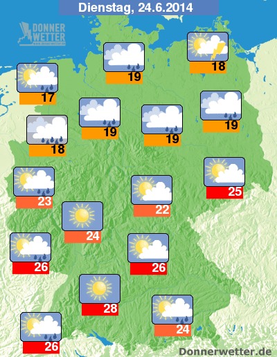 hinein und bringen zeitweise Schauer und Gewitter mit. Auch am Alpenrand können sich Schauer und Gewitter entwickeln. Ansosten bleibt es im Süden Deutschlands aber weitgehend trocken. Die Temperaturen steigen auf 17 Grad an der Ems und 28 Grad in Baden-Baden.