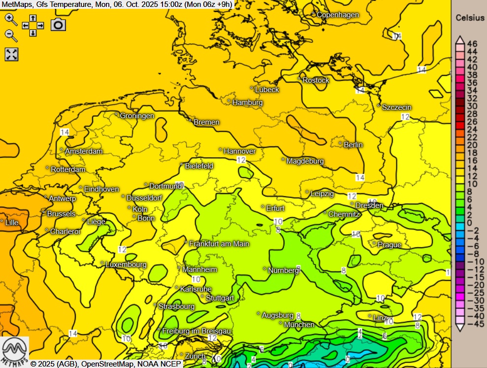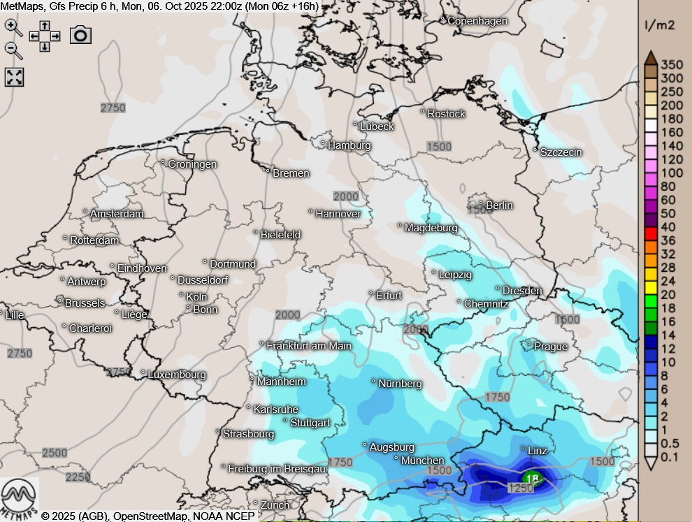 Die Lufttemperaturen am Montagnachmittag (15:00 Uhr) sowie die Sechs-Stunden-Regenmengen bis 22:00 Uhr nach GFS: