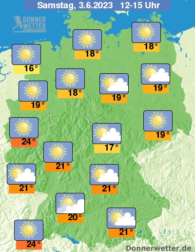 Heute Nachmittag ist es über Deutschland verbreitet locker bewölkt oder sonnig. Ein paar größere Quellwolken sind im Süden möglich, dabei bleibt es aber trocken. Die Temperatur liegt bei 16 Grad direkt an der Nordsee und etwa 24 Grad im Breisgau.