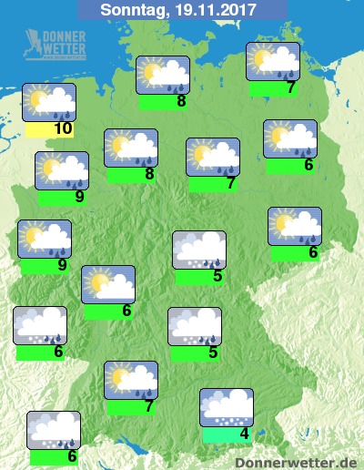 Am Sonntag ziehen vor allem über den Osten und Süden meist dichte Wolken, die hier zeitweise Regen, Schneeregen oder Schnee bringen. Im übrigen Land ist es auch zum Teil stark bewölkt, vor allem nachmittags zeigen sich aber auch Aufheiterungen, dazu sind einzelne Schauer möglich. Die Temperatur erreicht 4 bis 10 Grad. Über der Nordhälfte weht ein teils starker, an den Küsten ein oft stürmischer Wind.