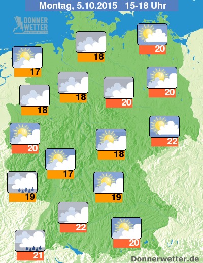 Heute Nachmittag ist es über dem Norden und Osten der Republik gebietsweise heiter, zum Teil ziehen aber auch dichtere Wolken durch, dazu bleibt es aber trocken. Über der Südwesthälfte Deutschlands ist es dagegen oft stark, hier und aber auch aufgelockert bewölkt und zunächst weitgehend trocken. Gegen späten Nachmittag und Abend zieht aus Südwesten her jedoch, teils langanhaltender Regen auf. Die Temperatur steigt auf 17 Grad an der Nordsee und bis auf spätsommerlich warme 22 Grad in Dresden.