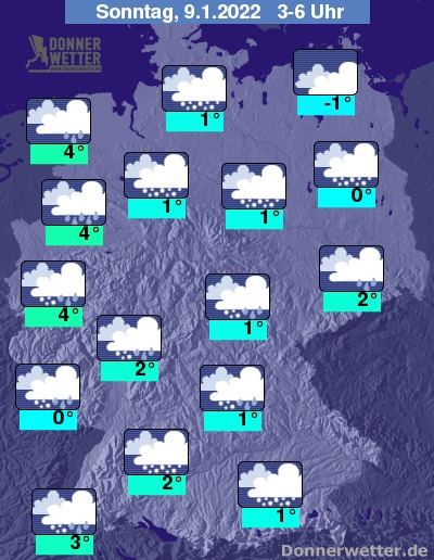 In der folgenden Nacht breiten sich Schnee, Schneeregen oder Regen auch bis in den Osten aus. In den westlichen Landesteile lassen die Niederschläge zum Morgen hin wieder nach. Es bleibt aber verbreitet bedeckt bei Tiefstwerten von 4 Grad in Köln und bis -1 Grad in Neubrandenburg. Es weht ein starker und teils stürmischer Wind. An der Nordsee herrscht Sturm.