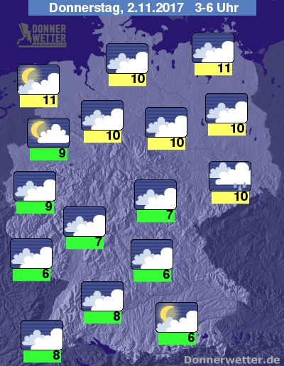 In der kommenden Nacht ist es verbreitet stark bewölkt oder trüb, vor allem im Osten und Nordosten ist anfangs noch etwas Regen möglich, sonst bleibt es weitgehend trocken. Auflockerungen zeigen sich im Nordwesten des Landes. Die Temperatur sinkt auf 11 bis 6 Grad.