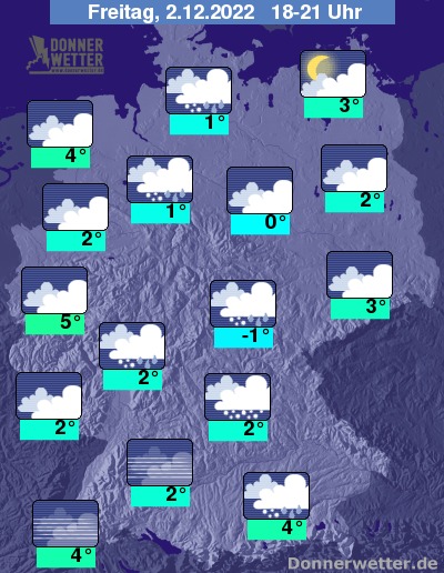In der Nacht zum Samstag fällt von der Mitte des Landes bis in den Osten gebietsweise Schnee, zum Teil auch Schneeregen oder Regen. Hierbei ist verbreitet mit glatten Straßen durch Schnee oder überfrierender Nässe zu rechnen!! Im übrigen Land ist es ebenfalls meist bedeckt und nur selten zeigen sich Auflockerungen, dazu bleibt es trocken. Stellenweise bildet sich Nebel. Die Temperatur sinkt auf 3 Grad in Bremerhaven und -3 Grad in Jena.