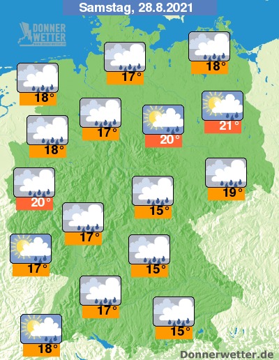 Am Samstag ist es meist stark bewölkt oder bedeckt, dabei bilden sich wiederholt Schauer, örtlich entwickeln sich auch mögliche Gewitter. Jedoch zeigen sich gebietsweise auch Auflockerungen. Die Temperatur steigt auf 15 Grad in München und bis 21 Grad in Berlin.