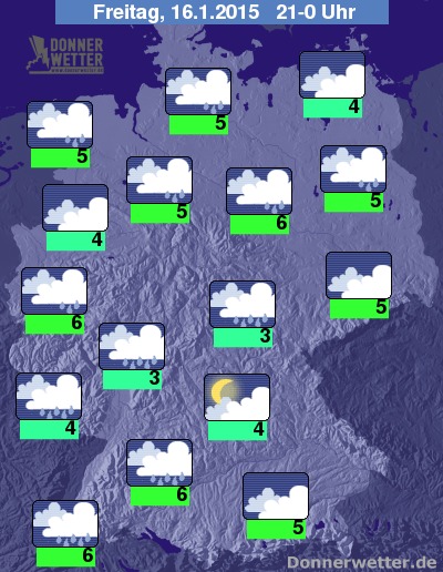 In der Nacht zum Samstag verlagert sich der Schwerpunkt des Regens auf die Südosthälfte der Republik, regional fällt auch Schneeregen oder Schnee, dabei bleibt die Wolkendecke geschlossen. Im Westen und Nordwesten kann es gebietsweise auch mal etwas auflockern, jedoch fällt auch hier zeitweise Regen, hier und da auch Schneeregen. Die Tiefstwerte liegen bei verbreitet 4 Grad und bis rund 2 Grad am Westerwald.