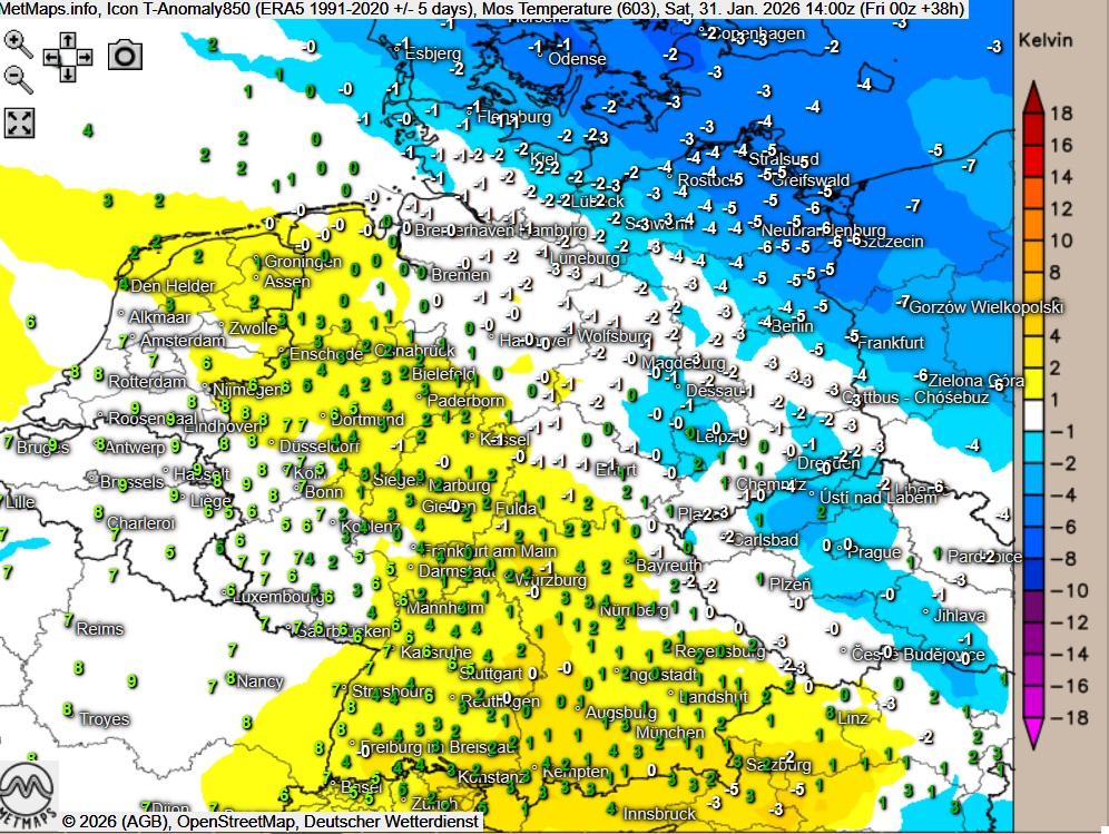 Während in den Norden und Osten mit östlicher Strömung weiterhin kalte Kontinentalluft einfließt, gibt im Süden und Westen milde Meersluft den Ton an. Höchstwerte um 10 Grad zeigt das Thermometer im Rheintal aktuell, eisige -6 Grad herrschen dagegen am Stettiner Haff.