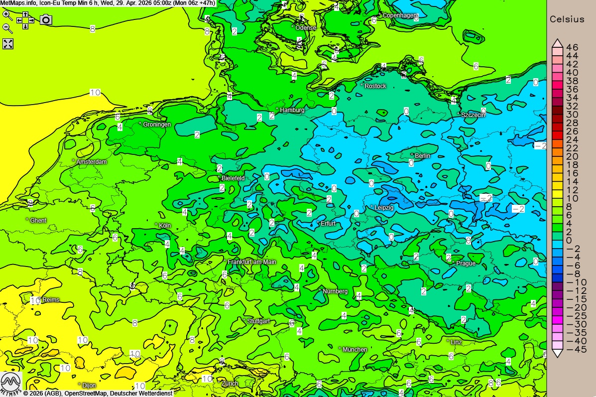 Über der Mitte und dem Norden zeigt sich die Nacht hingegen überwiegend klar. Das hat zur Folge, dass die Temperaturen stark sinken: Während es im bewölkten Süden bei 8 bis 2 °C frostfrei bleibt, kühlt es im Norden und Osten bei längerem Aufklaren auf bis zu -3 °C ab. In der gesamten Nordosthälfte muss verbreitet mit Bodenfrost gerechnet werden.