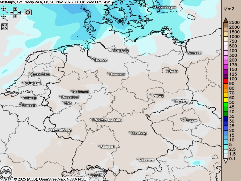 Die Strömungs- / Temperaturkarte für Donnerstagfrüh (06:00 Uhr) sowie die 24-Stunden-Regenmengen für Donnerstag nach GFS: