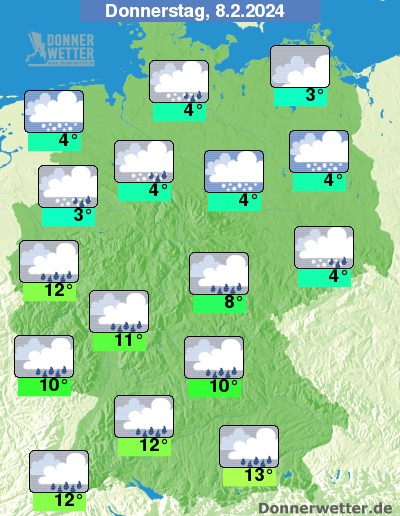 Am Donnerstag zeigt sich der Himmel über weiten Landesteilen dicht bewölkt oder bedeckt. Im Süden fällt dabei immer wieder Regen, der am Nachmittag allmählich nachlässt. In der Nordhälfte muss im Tagesverlauf immer wieder mit Niederschlägen gerechnet werden, die vom Niederrhein bis nach Sachsen auch als Schneeregen oder Schnee (bis in tiefe Lagen) fallen können. Vorsicht Glättegefahr!