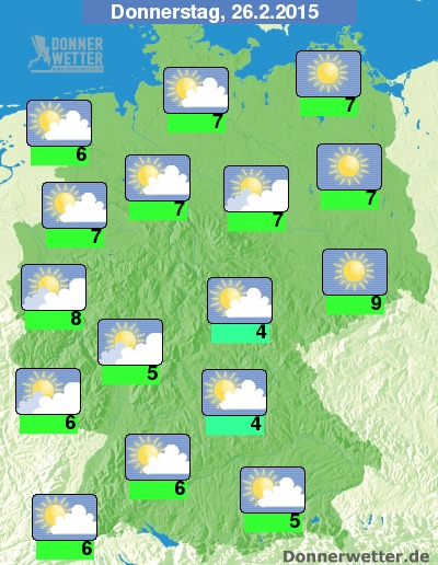 Heute kann sich zwischen den Wolken wieder häufiger die Sonne zeigen, gebietsweise halten sich aber auch dichte Wolken. Im Osten und Nordosten von Deutschlands ist es hingegen verbreitet sonnig. Bis zum Abend bleibt es überall trocken. Im Laufe des Abends ziehen in den westlichsten Landesteilen jedoch dichte Wolken mit Regen auf. Die Temperatur steigt auf 4 Grad im Coburger Land und bis 9 Grad in Niederschlesien.