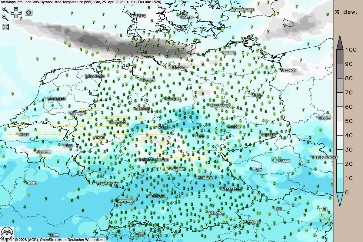 Die Wetter- und Temperaturkarte für Samstagfrüh (04:00 Uhr) nach ICON:
