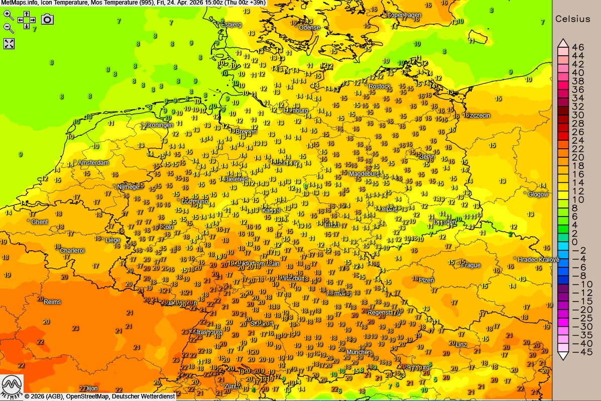 Lufttemperaturen Freitagnachmittag 15:00 nach ICON