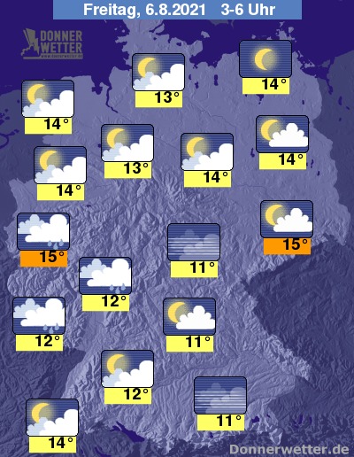 In der bevorstehenden Nacht ist der Himmel über dem Land zum Großteil nur locker bewölkt und teils sogar sternenklar. In den westlichen Landesteilen ziehen jedoch oft dichte Wolke durch, dabei fällt gebietsweise Regen, im übrigen Land bleibt es hingegen trocken. Die Temperatur sinkt auf 15 Grad in Dresden und bis 11 Grad in München.
