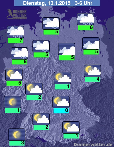 In der Nacht zum Dienstag ist es in der Südhälfte des Landes meist aufgelockert, gebietsweise auch nur leicht bewölkt, im Südwesten ist es örtlich auch sternenklar, dazu bleibt es trocken. Im Norden und Nordwesten ziehen hingegen dichte Wolken durch und es fällt zum Teil kräftiger Regen. Die Temperatur sinkt auf 7 Grad in Bremen und bis 0 Grad in Niederbayern. In der Nordhälfte des Landes weht ein frischer bis starker und in Böen stürmischer Wind. An der See und auf den Hochlagen der Norddeutschen Mittelgebirge ist es teils stürmisch mit möglichen Sturmböen.