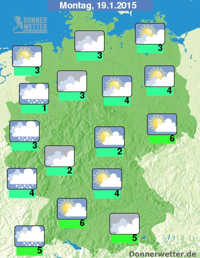 Heute ist es vor allem in der Osthälfte Deutschlands noch oft aufgelockert bewölkt, sonst und am Nachmittag auch nach Osten hin ist es jedoch überwiegend stark bewölkt. Bereits ab den Vormittagsstunden ziehen am Westrand der Republik Schnee, Schneeregen oder Regen auf, dazu kann es gefährlich glatt auf den Straßen werden, in der Osthälfte des Landes bleibt es dagegen weitgehend trocken. Die Temperatur steigt auf 1 Grad am Niederrhein und bis 6 Grad in Dresden.
