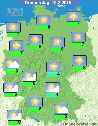 Heute scheint verbreitet die Sonne, dabei bleibt der Himmel häufig komplett blau, vor allem im Westen und Süden können aber auch zeitweise einige Wolken durchziehen. Es bleibt dazu landesweit trocken. Die Temperaturen steigen auf 4 Grad im Grabfeld und bis 9 Grad in der Kölner Bucht.
